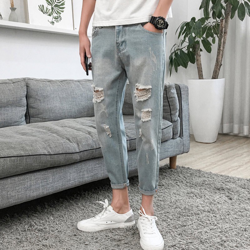 Cpmax 春夏新款水洗刷破九分小腳丹寧牛仔褲男長褲男牛仔褲男破褲牛仔破褲淺色牛仔九分褲 J11 露天拍賣